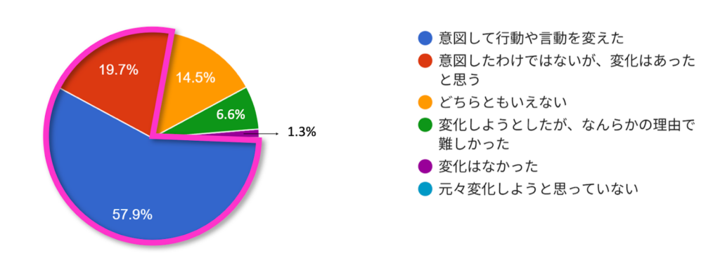 研修期間中に実施した職場実践に関するアンケートでは、約80%が「意図的に自身の行動や言動に何らかの変化があった」と答えています。